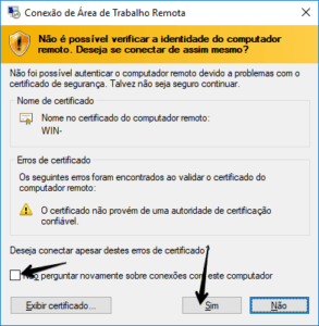 4 – Caso apareça detalhes do certificado da maquina de destino  basta marcar “Não perguntar novamente sobre conexões com este computador” em seguida clicar em SIM